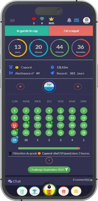 Le compteur de jours d'abstinence offre une mesure tangible de votre progrès, vous motivant et facilitant le partage de votre réussite avec la communauté.